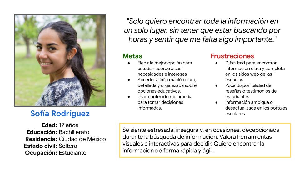 En la investigación de usuarios logré identificar que el enfoque debía ser diseñar una solución integral y centrada en mejorar toda la experiencia de los usuarios al buscar información de escuelas.